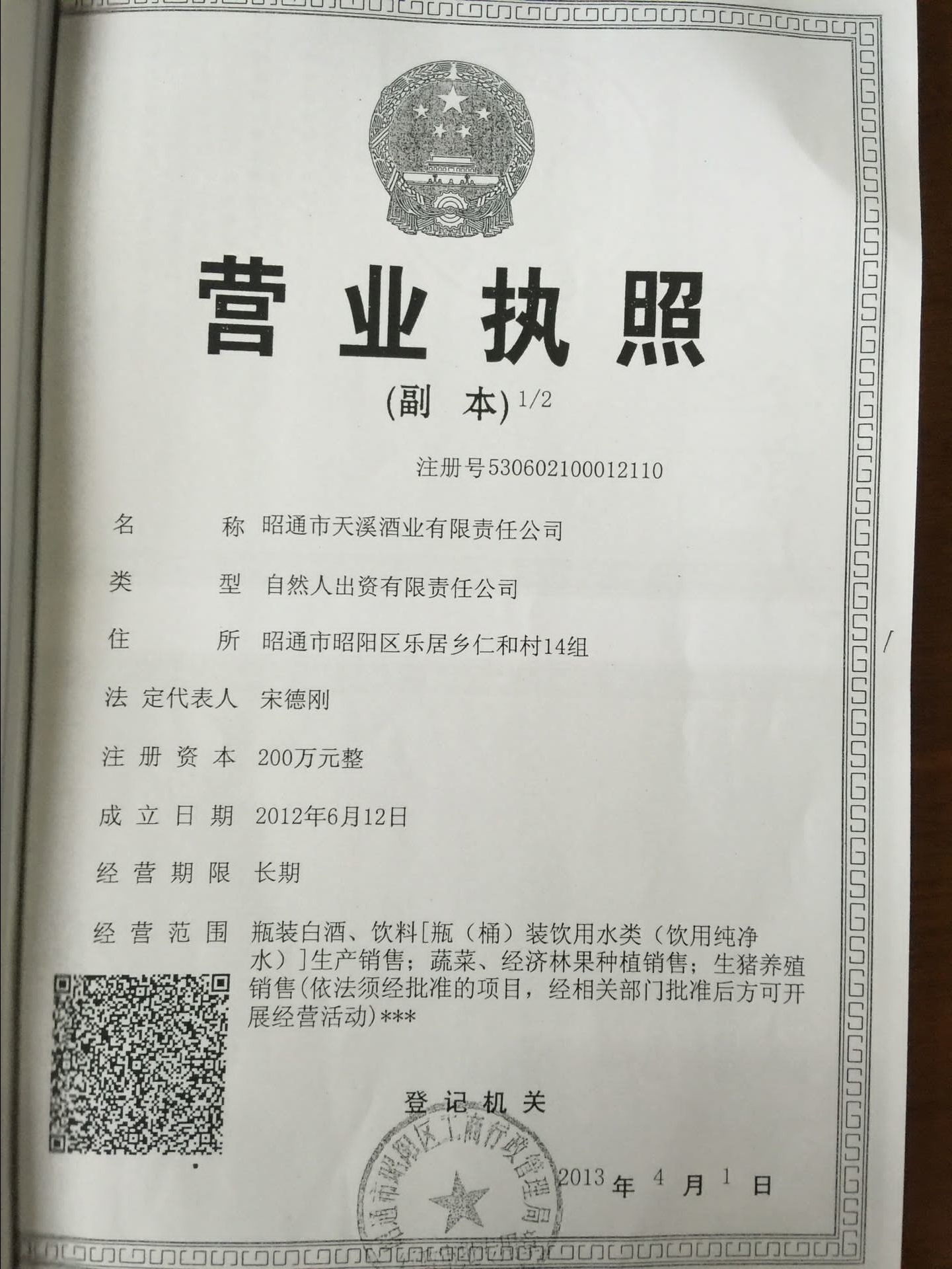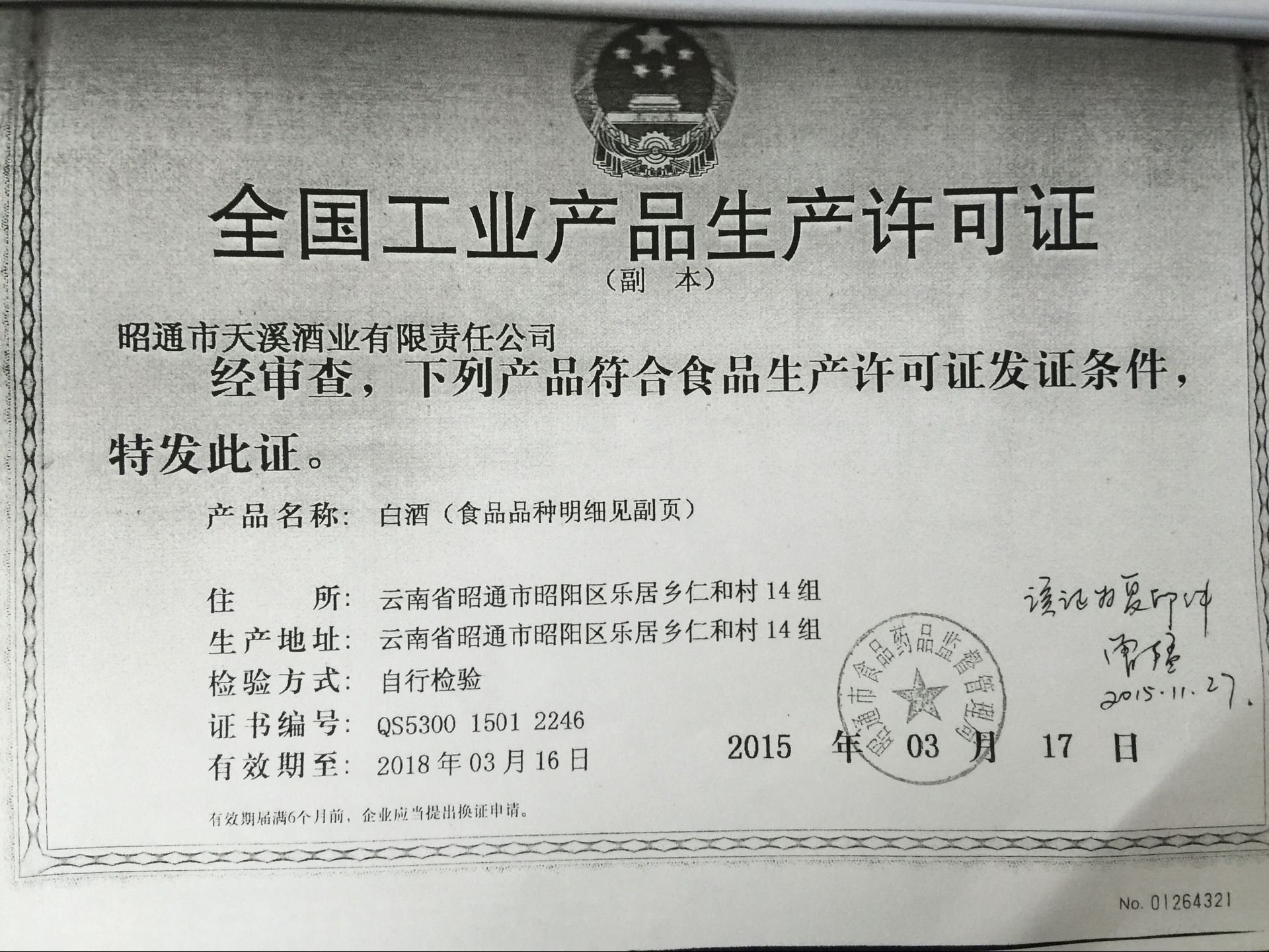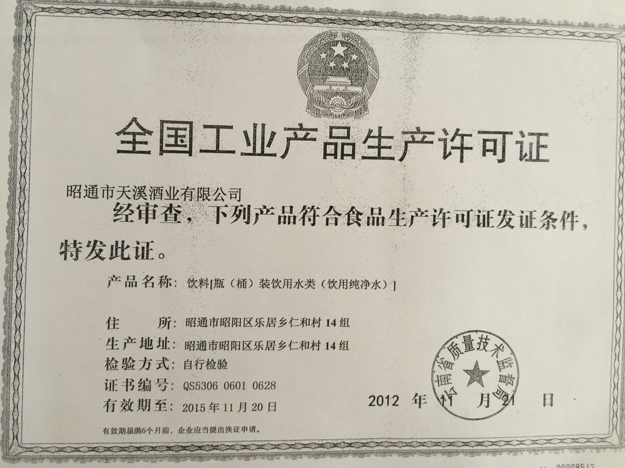 昭通市天溪酒業(yè)有限公司資質(zhì)證照復(fù)印件