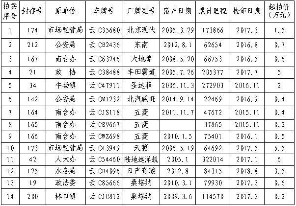 經(jīng)鎮(zhèn)雄縣人民政府批準(zhǔn),公開拍賣鎮(zhèn)雄縣公務(wù)用車改革取消車輛(第三期)14輛。相關(guān)事項(xiàng)如下:
