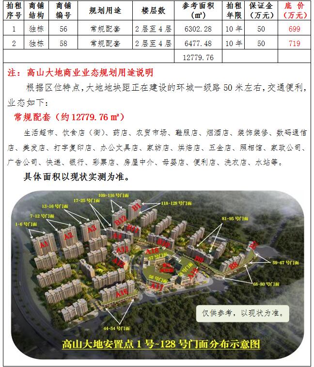 (二)拍租位于鎮(zhèn)雄縣舊府街道高山大地安置點(diǎn)2棟獨(dú)立商鋪使用權(quán)。以棟為單位拍租。詳見(jiàn)下表: