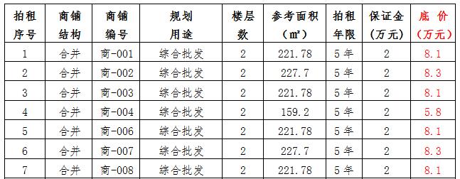 (一)拍租位于鎮(zhèn)雄縣南臺(tái)街道呢嚕坪安置點(diǎn)7棟獨(dú)立商鋪使用權(quán)。以棟為單位拍租。詳見(jiàn)下表: