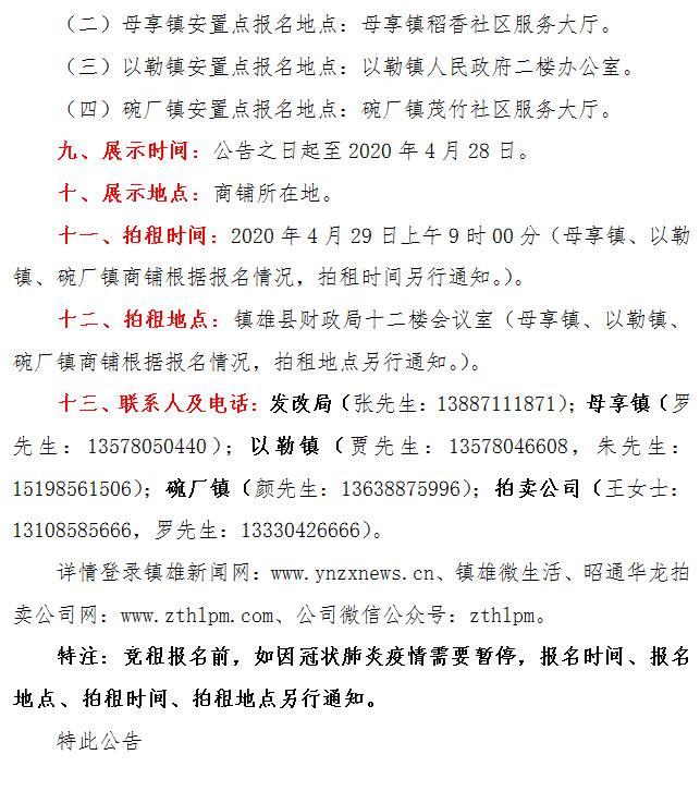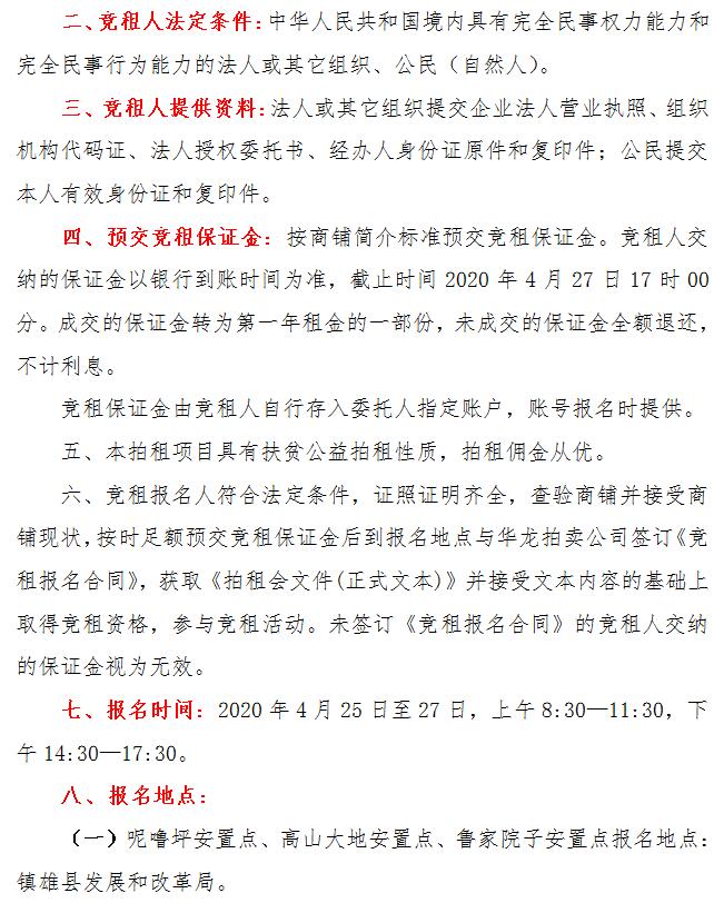 經(jīng)鎮(zhèn)雄縣人民政府批準(zhǔn),受相關(guān)部門(mén)(政府)委托,公開(kāi)拍租位于鎮(zhèn)雄縣易地扶貧搬遷呢嚕坪安置點(diǎn)7棟獨(dú)立商鋪使用權(quán)、高山大地安置點(diǎn)2棟獨(dú)立商鋪使用權(quán)、魯家院子安置點(diǎn)11間商鋪使用權(quán)、母享安置點(diǎn)132間商鋪使用權(quán)、以勒物流城安置點(diǎn)36間商鋪使用權(quán)、碗廠安置點(diǎn)109間商鋪使用權(quán)。相關(guān)事項(xiàng)如下: